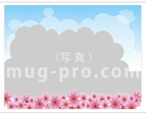 青空とコスモスの花が敷き詰められたフレームです。雲のフォルムがマンガの雲のようにモコモコしていてピンクのコスモスのキュートさと合っています。写真の部分も雲の形になっていて一体感が出ますね。